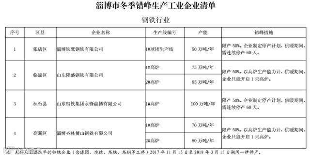 近日,淄博印发了冬季错峰方案。涉及到钢铁、焦化、建材、水泥、铸造、陶瓷等重点行业。焦化行业,除2家企业外,其他企业停产6个月。其他重点行业,个别企业限产,大部分企业停产4个月。详情如下:
