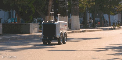 它的工作流程是这样的:配送人员先将相应订单放到无人车的箱子内,无人车会根据订单信息自动选定配送路径,然后按照路径规划自动行驶,并确定订单停车站点。