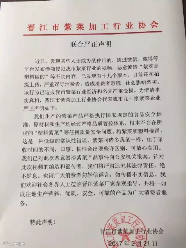 “紫菜是塑料做的”的视频谣言仍持续发酵,近日,记者从几家受影响的紫菜加工企业了解到,厂家联合经销商和终端超市向公安机关报案,目前已锁定两位谣言发布者,相关证据已收集齐全,一经立案绝不姑息。