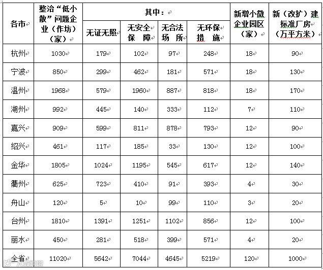 2017—2019年,浙江每年要淘汰落后产能涉及企业1000家以上,淘汰和整治“低小散”问题企业(作坊)10000家以上,新改扩建标准厂房1000万平方米以上,新增小微企业园100家以上,完成“小升规”企业2000家以上,推动10000家以上中小微企业入园提升发展。