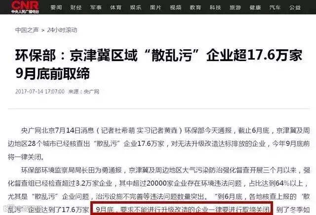 据环保部7月14日通报,要将从严治理“散乱污”企业作为强化督查的重点内容之一,对无法升级改造达标排放的企业,今年9月底前一律关闭!截止6月底,京津冀及周边地区28个城市已经核查出“散乱污”企业17.6万家!