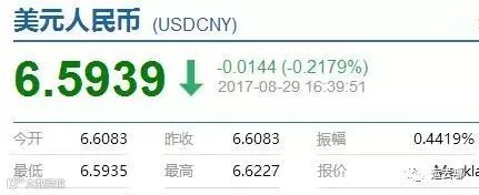 2017年8月24日,在岸人民币兑美元16:30收盘,报6.66。