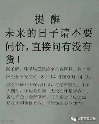 这就是目前各行业的真实写照。环保来了,小厂关了,大厂检修,停产整顿……接下来,别再跟我们说能不能优惠了,你该关心有没有货啦!