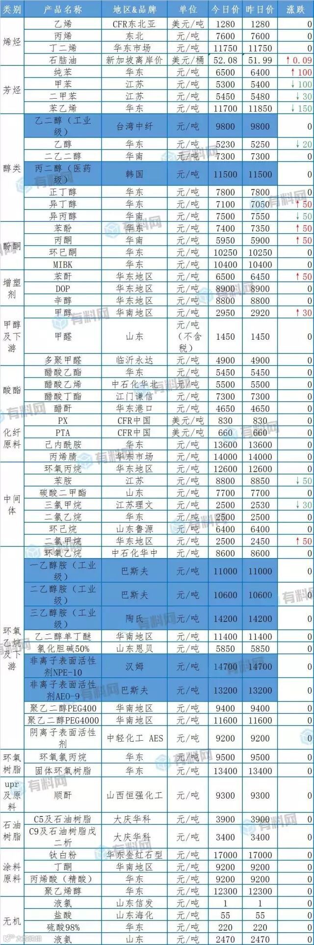 【化工报价】9月7日主要化工产品涨跌定价