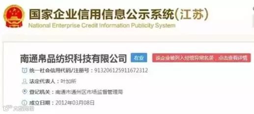 在【国家企业信用信息公示体系】中查询发现,南通帛品纺织科技有限公司于1月13日被列入运营反常名录,原因是工商行政管理部门在依法履职过程中经过挂号的居处或运营场所无法取得联系。