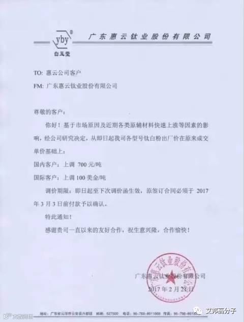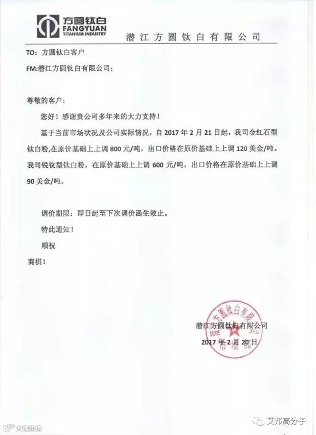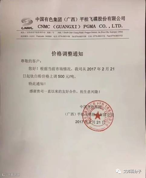从2月21日起,该公司各型号钛白粉出厂价在原料成交单价基础上,国内客户上调700/吨;国际客户上调100美元/吨。