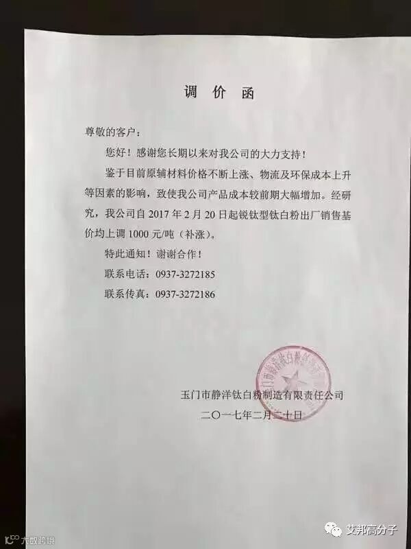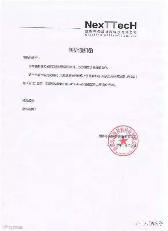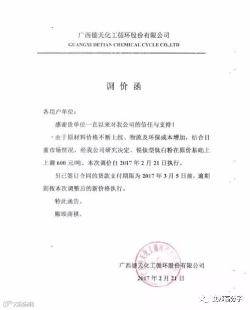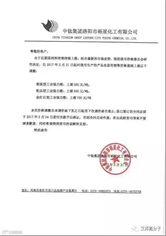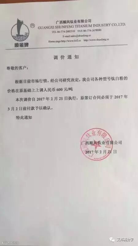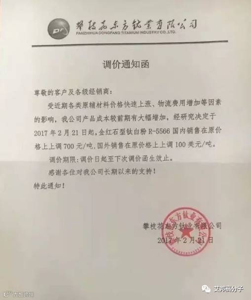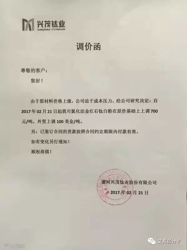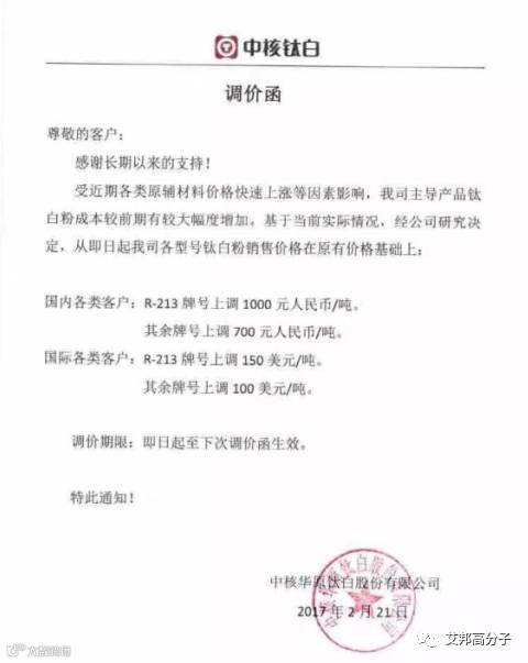 从2月21日起,该公司钛白粉上涨价格幅度国内在700-1000元,国外在100-150美元。