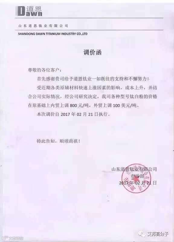 从2月21日起,道恩各种型号钛白粉的价格在原基础上内贸上调800元/吨,外贸上调100美元/吨。