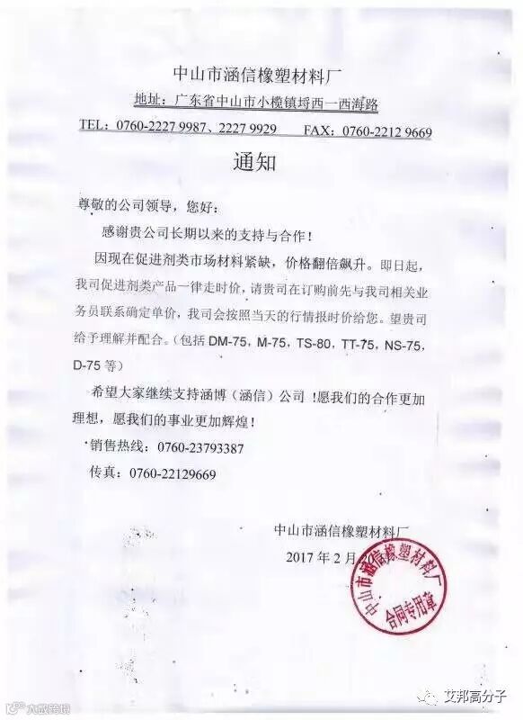 2月20日起,该公司促进剂类产品一律走时价,会根据当天行情报价,产品包括:DM-75、M-75、TS-80、NS-75、D-75等。