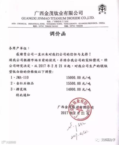从2月21日起,该公司锐钛型钛白粉的价格做出以下调整:JMA-110、金红石粗品、搪陶瓷级分别调整为15000元/吨,15500元/吨以及14000元/吨。