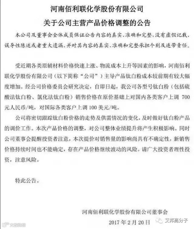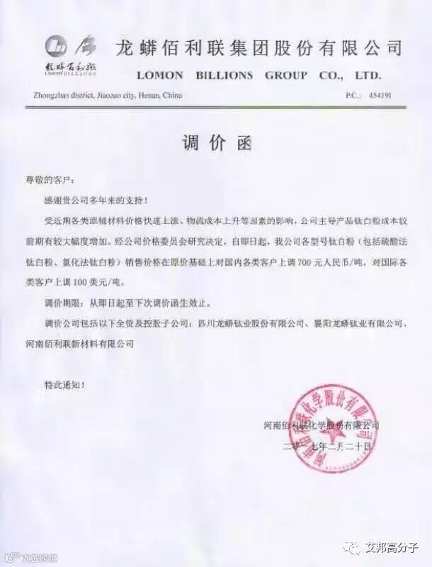 2月20日起,河南伯利联化学股份有限公司各种型号钛白粉销售价格在原价基础上对国内客户上调700元/吨,对国际客户上调100美元/吨。