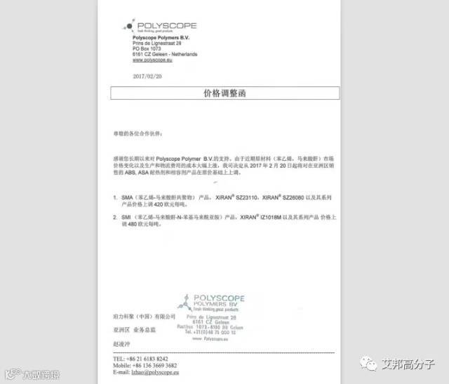 荷兰POLYSCOPE(珀力科聚)公司是全球领先的苯乙烯马来酸酐共聚物(SMA)制造商,珀力科聚(中国)有限公司将于2月20日起将对亚洲区销售的ABS、ASA耐热剂和相容剂产品在原价格基础上上调,SMA产品,包括:XIRAN®SZ23110、XIRAN®SZ26080以及其系列产品价格上调420欧元/每吨。更多请看下图!