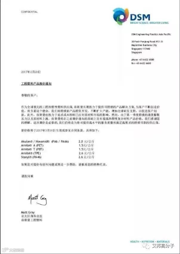 帝斯曼工程塑料产品:PA6/PA66、PET、PBT、PA46等,将与3月16日实施新价格,具体可以看以下调价函: