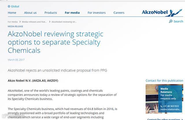 阿克苏诺贝尔公司确认,PPG工业集团对阿克苏诺贝尔的全面股本公开做出了事先未经商议,非约束性且有前提条件的收购要约,收购阿克苏诺贝尔每股对价为现金54.00欧元外加0.3股PPG工业股票 (相当于2017年2月28日每股价格为83.00欧元,含2016年股息)。