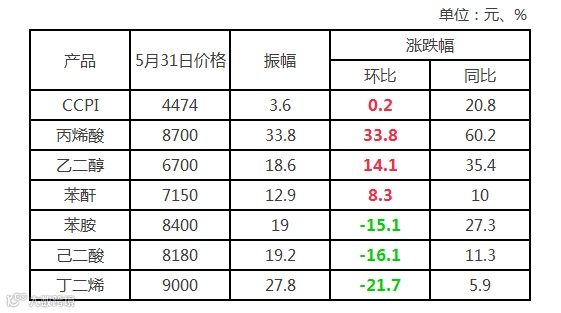丙烯酸及酯:五月份丙烯酸及酯产品表现抢眼,由于部分丙烯酸装置延迟开车,市场上供应较少,利好消息支撑价格上涨。丙烯酸在一个月内上涨了33.8%,月末收报8700元/吨。丙烯酸酯系列产品同样呈现涨势,据悉,巴斯夫德克萨斯18万吨/年丙烯酸丁酯装置宣布遭遇不可抗力。月内丙烯酸丁酯、丙烯酸异辛酯及丙烯酸甲酯分别收涨27.2%、12.0%和7.0%。