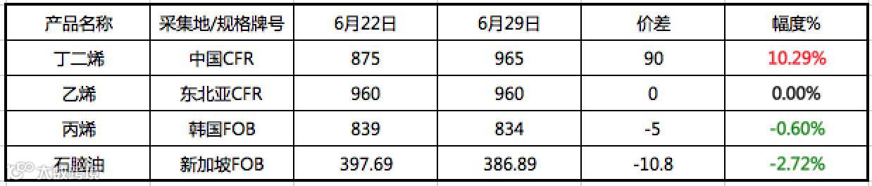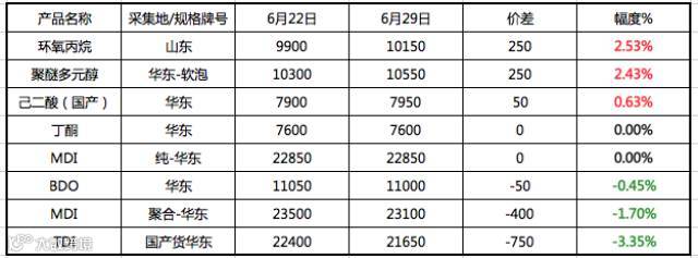 聚合MDI:本周国内聚合MDI市场高位僵持后小幅回落。万华、巴斯夫厂家7月份挂牌价与6月份持平,低于市场人士预期。贸易商对后市信心多不足,下游采购积极性低,但因场内现货仍将紧,料下周市场小幅下滑。