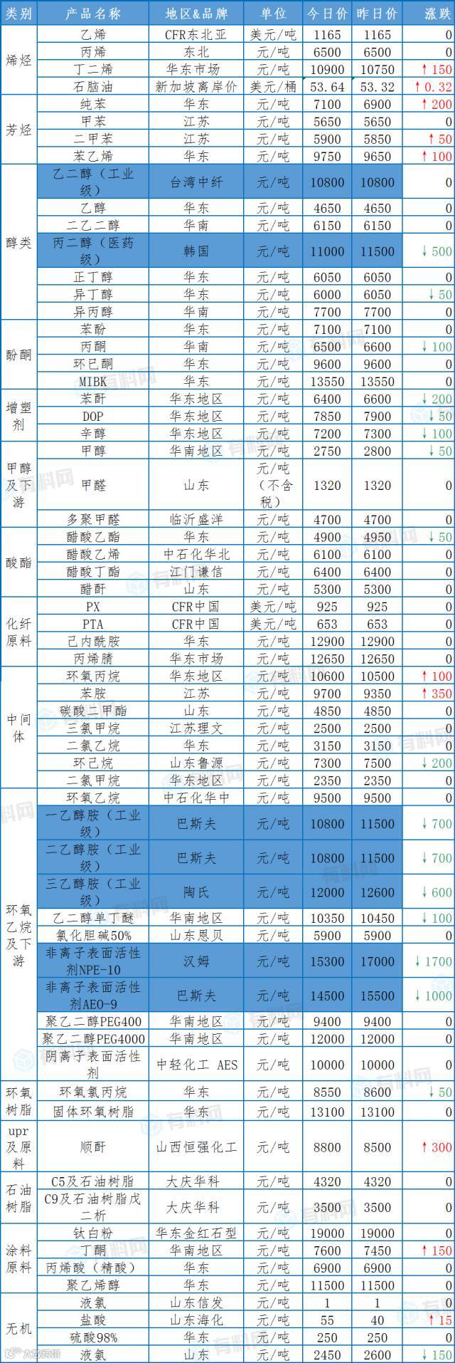 【大概】4月12日主要化工产品涨跌定价参考