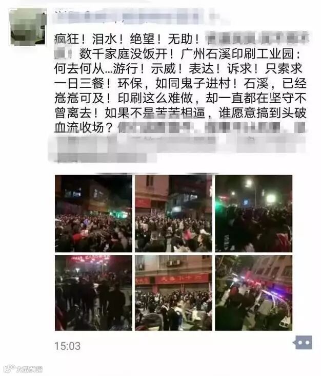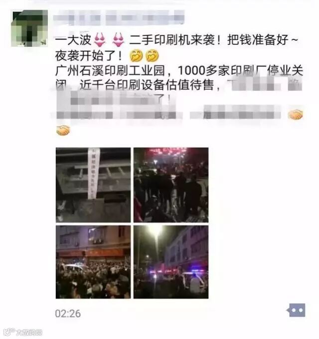 2016年12月30日凌晨2点左右,相关行业人士在朋友圈发布了一条“广州石溪印刷工业园,1000多家包装印刷厂停业关闭,近千台印刷设备估值待售“等一系列的消息,并配上了几张疑似有关部门查封现场的图,当时虽然已凌晨2点多,但是该处聚集了大量的人员,如若真如该人士所说,此举之下1000多家印刷厂将被停业关闭,对于这些企业来说,绝对是致命打击!