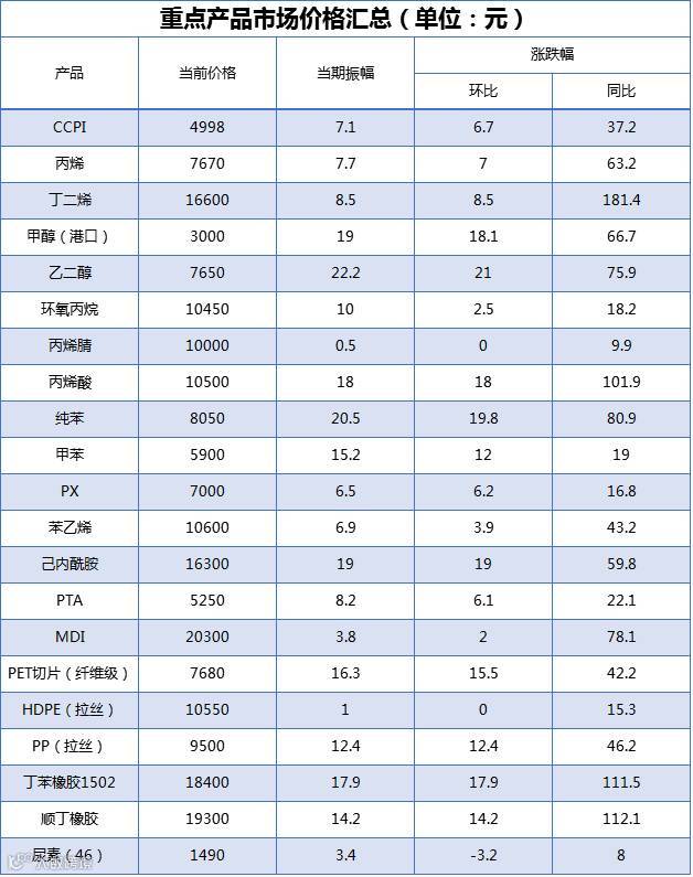 除了PVC之外,其他都处于上行状态。ABS市场月初开启暴涨模式,各企业连续上调报价,市场炒作气氛较浓,大涨2500元之多。造成ABS上涨的主要原因也是成本上涨和供应紧张。目前场内流通货源不多,贸易商捂盘惜售,下游买涨不买跌,市场有继续调涨的可能。受期货市场的拉动,PP现货市场拉涨明显,石化厂家积极推动,下游围观为主,采购积极性不强,后市PP将以调整为主。因原料苯乙烯的强势支撑,部分企业检修库存低位,导致PS企业上调出厂报价,贸易商趁机炒作,PS市场走高,但是下游需求不佳,恐涨势难以持续。