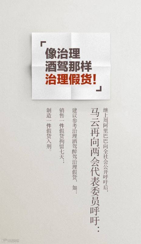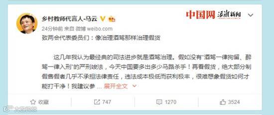 日前,马云在微博上发表 " 致两会代表委员们:像治理酒驾那样治理假货 " 的倡议文章。其中写到:" 我建议参考酒驾醉驾治理,设想假如销售一件假货拘留七天,制造一件假货入刑,那么我想今天中国的知识产权保护现状、食品药品安全现状,我们国家未来的创新能力一定会发生天翻地覆的变化。"引起了包括实体经济大佬们在内的一片叫好声。