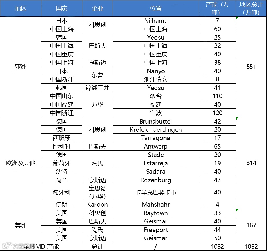 全球MDI企业统计