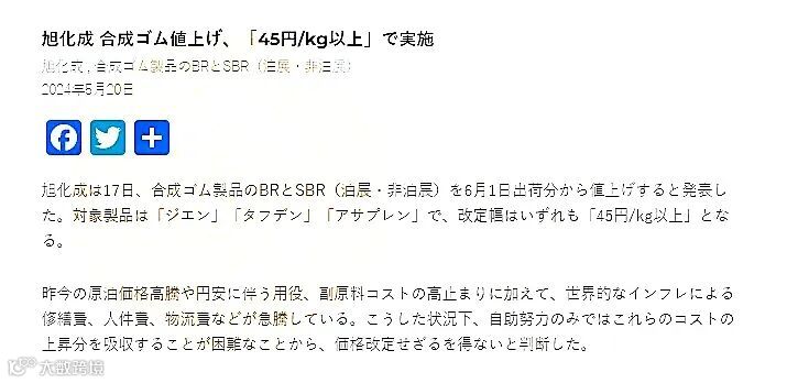 旭化成发函对旗下合成橡胶制品的BR和SBR提价45日元/公斤(约合人民币2083元/吨)以上。