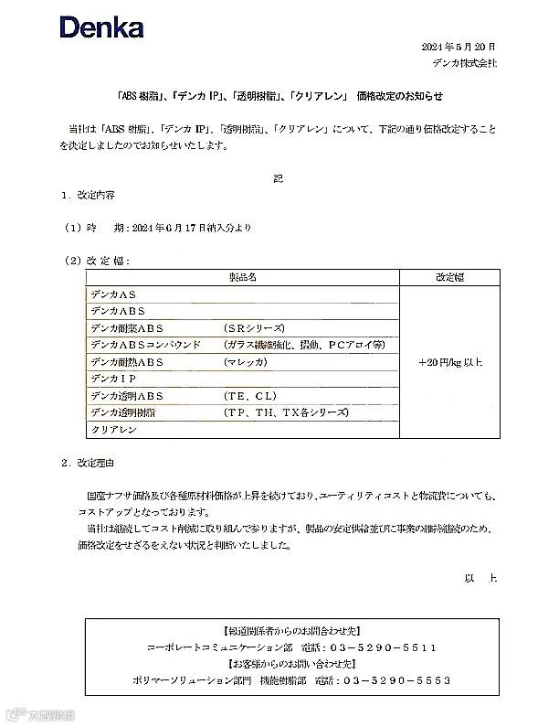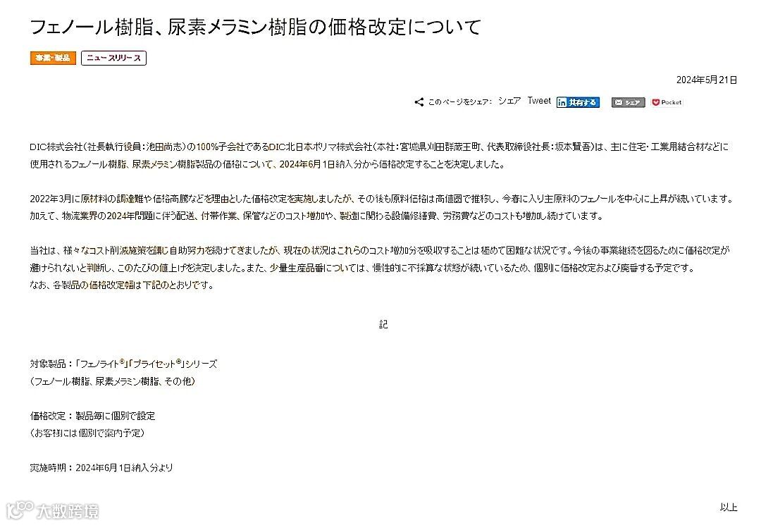 ▶▶另外,DIC旗下北日本聚合物株式会社也发布涨价函,对主要用于住宅工业用结合材料等的酚醛树脂、尿素三聚氰胺树脂产品进行涨价。涨价实施时间同样定在2024年6月1日。不过,涨价函中并没有明确提到具体涨价幅度,而是称将对每个产品进行单独设定。