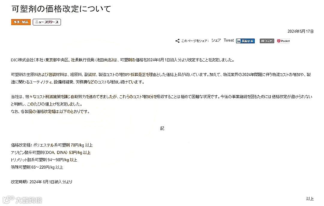 DIC株式会社宣布增塑剂产品价格修自2024年6月1日交货时起开涨: