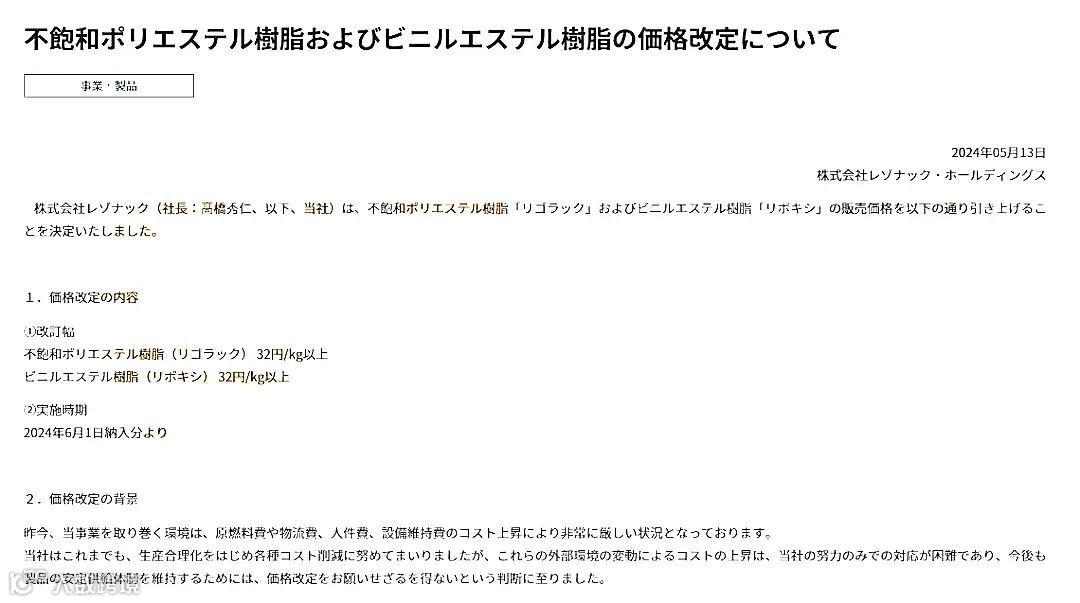 雷佐纳克株式会社决定自6月1日起,提高不饱和聚酯树脂“Polygrac”及乙烯基酯树脂“Polyxid”的售价,称在此前价格基础上提涨32日元/kg(约合人民币1481元/吨)以上。