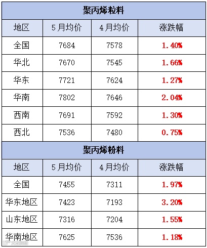 5月,聚丙烯市场震荡上涨,价格重心上移。聚丙烯粒料月均价为7684元/吨,较上月均价上涨106元/吨,涨幅为1.40%。聚丙烯粉料月均价为7455元/吨,较上月均价上涨144元/吨,涨幅为1.97%。