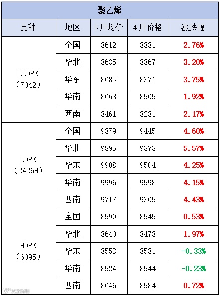 本月聚乙烯市场震荡上行,价格以涨为主。LLDPE(7042)市场均价为8612元/吨,较上月均价上涨231元/吨,涨幅为2.76%;LDPE(2426H)市场均价为9879元/吨,较上周均价上涨434元/吨,涨幅为4.60%;HDPE(6095)市场均价为8590元/吨,较上周均价上涨45元/吨,涨幅为0.53%。