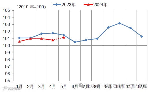 5月份,受大规模设备更新和下游消费品行业效益持续向好,化工下游行业需求有望进一步恢复,综合测算到化工行业综合景气指数初值为101.2点,较4月份上涨0.4点。