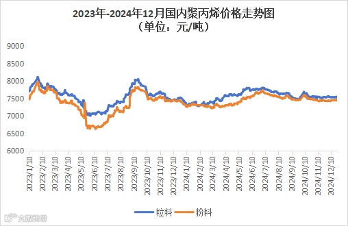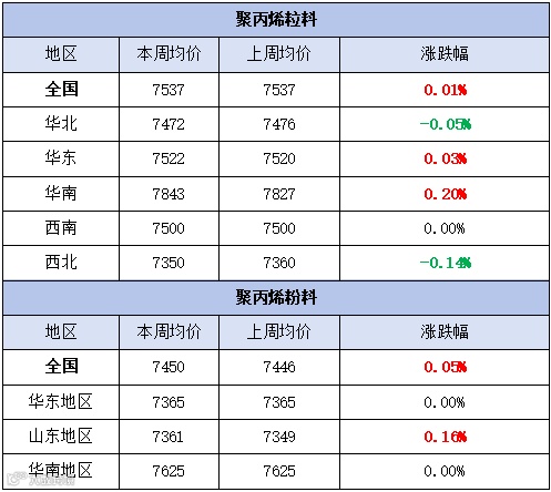 本周聚丙烯市场区间整理,价格小幅涨跌。粉料全国均价为7538元/吨,较上周均价上涨1元/吨,涨幅为0.01%。粒料全国均价为7450元/吨,较上周均价上涨元/吨,涨幅为0.05%。
