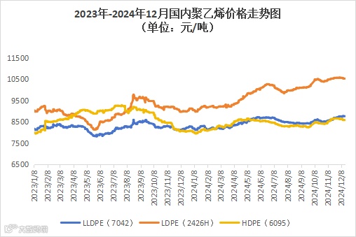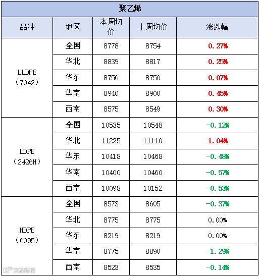 本周聚乙烯市场区间震荡,价格涨跌互现。LLDPE(7042)市场均价为8778元/吨,较上周均价上涨24元/吨,涨幅为0.27%;LDPE(2426H)市场均价为10535元/吨,较上周均价下跌12元/吨,跌幅为0.12%;HDPE(6095)市场均价为8573元/吨,较上周均价下跌32元/吨,跌幅为0.37%。