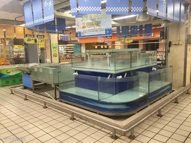 与其他人流如织的超市形成巨大反差的,乐天玛特有些萧条,摆放在货架上的商品品类也残缺不全,水产柜台已经撤离。在超市内,除了工作人员外,顾客屈指可数。