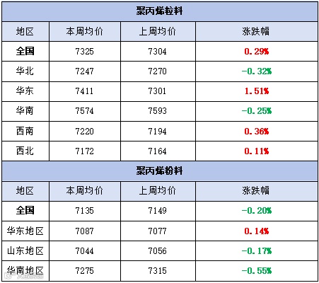 本周聚丙烯市场震荡波动,价格小幅涨跌。粉料全国均价为7325元/吨,较上周均价上涨21元/吨,涨幅为0.29%。粒料全国均价为7135元/吨,较上周均价下跌14元/吨,跌幅为0.20%。