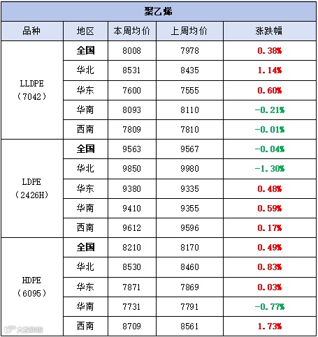 本周聚乙烯市场区间震荡,价格涨跌互现。LLDPE(7042)市场均价为8008元/吨,较上周均价上涨30元/吨,涨幅为0.38%;LDPE(2426H)市场均价为9563元/吨,较上周均价下跌4元/吨,跌幅为0.04%;HDPE(6095)市场均价为8210元/吨,较上周均价上涨40元/吨,涨幅为0.49%。