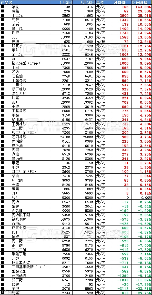 原油的持续高位上行让2024年的化工市场迎来开门红。2月以来,化工行情逐步升温。据广化君数据统计,从2024年1月2日至2024年3月28日,67种监测产品中,44种同比上涨,占比65.67%。其中丁二烯、纯苯、异丁烯、乳胶、SBS、苯乙烯、聚乙烯醇涨额超过了1000元/吨。
