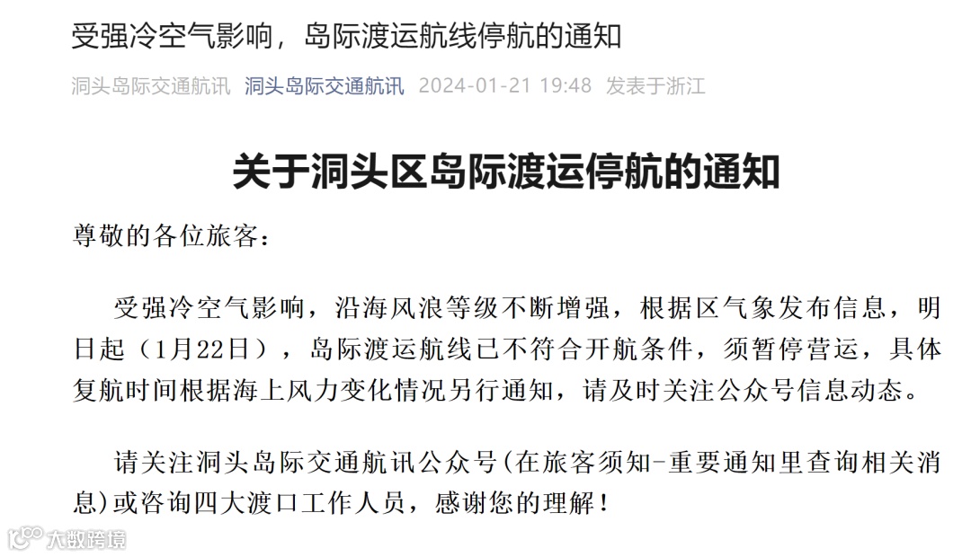 浙江:1月22日,浙江温州发布通知,洞头岛际渡运航线已不符合开航条件,须暂停营运。