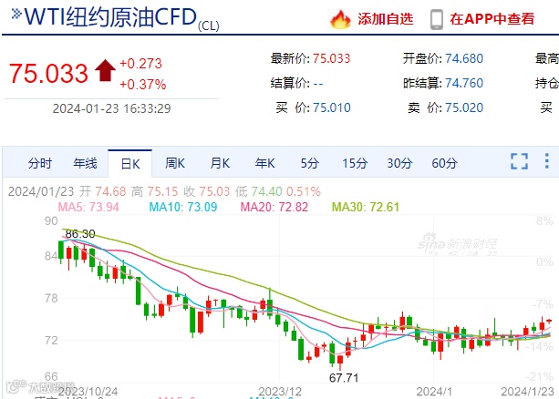 红海危机继续加剧,全球供应面临的持续风险为油价提供了支撑,加上近期OPEC上调2024年全球石油需求预期、美油库存大幅减少等因素,原油期货价格上涨,2024年2月交货的WTI原油期货上涨1.52美元/桶(2.09%),结算价报74.08美元/桶;2024年3月交货的布伦特原油期货上涨1.22美元/桶(1.57%),结算价报79.1美元/桶。