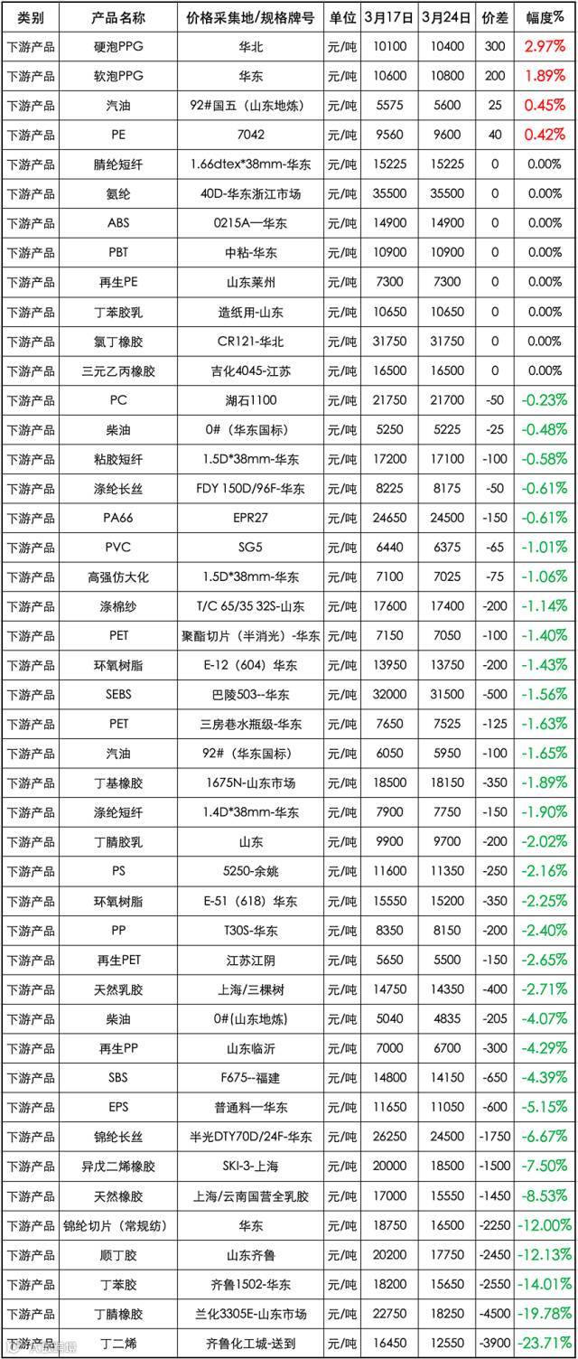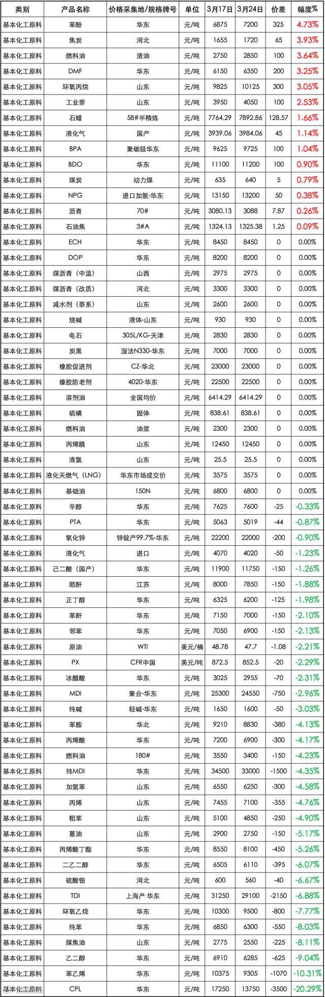 国际原油运行偏弱,拖累市场商谈气氛,国内有机化工近段时间以来多数产品也跌跌不休,本周也延续前期“一片绿”的行情。在广州化工城最新消息小编监测的124个产品之中,有19个产品上涨,占15.3%,28个产品持稳,占22.5%,77个产品下降,占62.2%。上涨产品前三名分别是苯酚、焦炭、燃料油,涨幅分别4.73%、3.93%、3.64%,下跌产品前三名分别是丁二烯、CPL、丁腈橡胶,跌幅分别在23.71%、20.29%、19.78%。