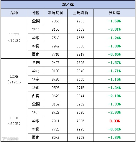 本周聚乙烯市场偏弱震荡,价格下跌为主。LLDPE(7042)市场均价为7856元/吨,较上周均价下跌127元/吨,跌幅为1.59%;LDPE(2426H)市场均价为9475元/吨,较上周均价下跌151元/吨,跌幅为1.57%;HDPE(6095)市场均价为8152元/吨,较上周均价下跌110元/吨,跌幅为1.33%。