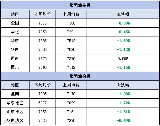 本周聚丙烯市场震荡走弱,价格以跌为主。粉料全国均价为7315元/吨,较上周均价下跌65元/吨,跌幅为0.88%。粒料全国均价为7085元/吨,较上周均价下跌93元/吨,跌幅为1.30%。