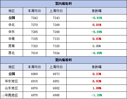 本周聚丙烯市场盘整为主,价格窄幅涨跌。粉料全国均价为7242元/吨,较上周均价下跌1元/吨,跌幅为0.01%。粒料全国均价为6889元/吨,较上周均价上涨16元/吨,涨幅为0.23%。