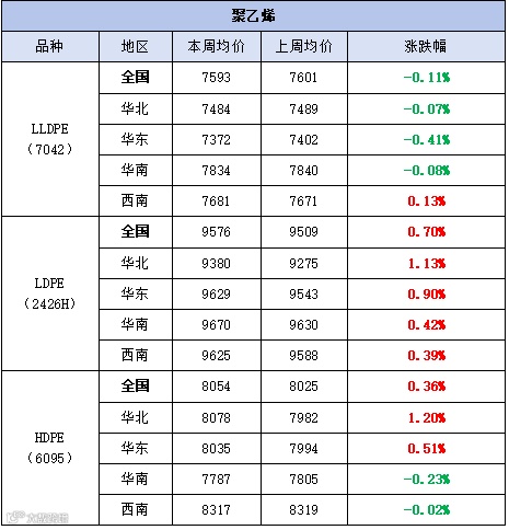 本周聚乙烯市场震荡整理,价格涨跌互现。LLDPE(7042)市场均价为7593元/吨,较上周均价下跌8元/吨,跌幅为0.11%;LDPE(2426H)市场均价为9576元/吨,较上周均价上涨67元/吨,涨幅为0.70%;HDPE(6095)市场均价为8054元/吨,较上周均价上涨29元/吨,涨幅为0.36%。