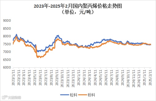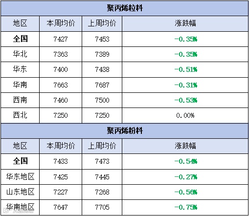 本周聚丙烯市场小幅下行,价格以跌为主。粉料全国均价为7427元/吨,较上周均价下跌26元/吨,跌幅为0.35%。粒料全国均价为7433元/吨,较上周均价下跌40元/吨,跌幅为0.54%。