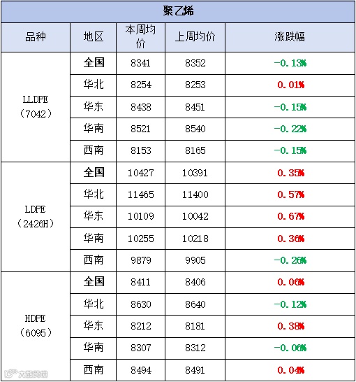 本周聚乙烯市场窄幅弱行,价格涨跌不一。LLDPE(7042)市场均价为8341元/吨,较上周均价下跌11元/吨,跌幅为0.13%;LDPE(2426H)市场均价为10427元/吨,较上周均价上涨36元/吨,涨幅为0.35%;HDPE(6095)市场均价为8411元/吨,较上周均价上涨5元/吨,涨幅为0.06%。
