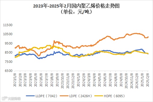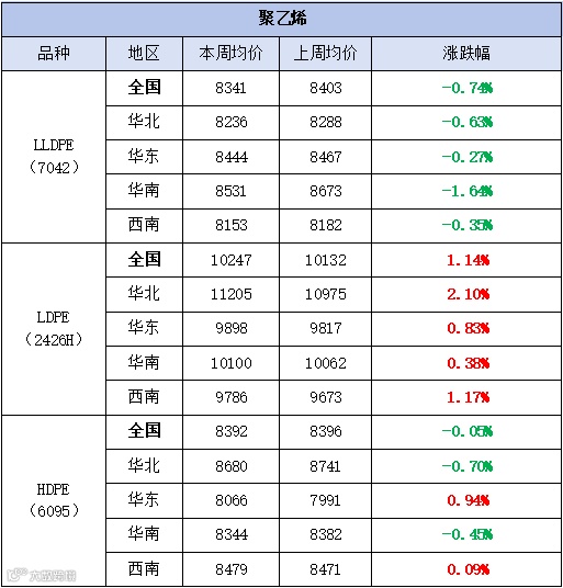 本周聚乙烯市场弱势运行,价格涨跌互现。LLDPE(7042)市场均价为8341元/吨,较上周均价下跌62元/吨,跌幅为0.74%;LDPE(2426H)市场均价为10247元/吨,较上周均价上涨115元/吨,涨幅为1.14%;HDPE(6095)市场均价为8392元/吨,较上周均价下跌4元/吨,跌幅为0.05%。