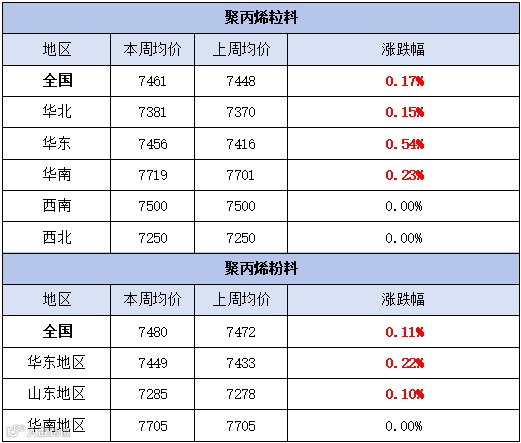 本周聚丙烯市场止跌向上修复,价格窄幅上涨。粉料全国均价为7461元/吨,较上周均价上涨13元/吨,涨幅为0.17%。粒料全国均价为7480元/吨,较上周均价上涨8元/吨,涨幅为0.11%。