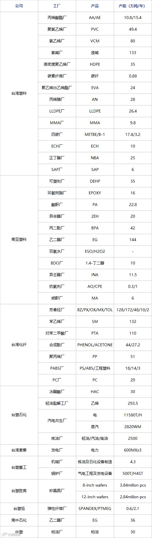 台湾中油包括的企业有:台聚、亚聚、台氯、东联、中纤、国乔、台苯、大连、李长荣、台湾中石化等。包括的产品有:ABS、TPE、PTA、LDPE、HDPE、VCM、EG、SM、EVA、PP、PS、AN、SBR、NBR、CPL等。